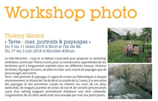 Workshop photo animé par Thierry Girard – « Terre – mer, portraits & paysages ». Du 1er au 3 juin, à Moutier d’Ahun et ses alentours. La Villa Pérochon – Cacp et La Métive s’associent pour proposer ce workshop ambitieux, animé par Thierry Girard, pour sa connaissance approfondie de ces territoires qu’il a longuement arpentés dans ses…