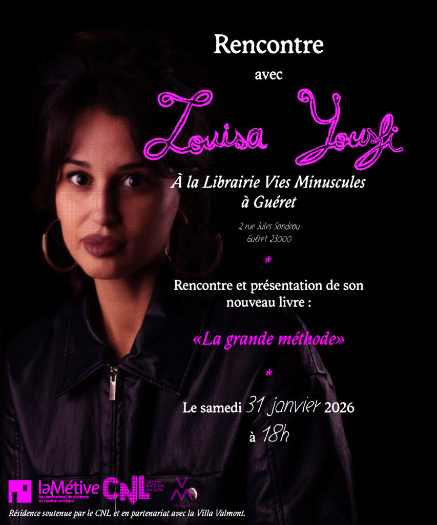 La Métive vous invite, le samedi 31 janvier 2026 à la Librairie Vies Minuscules à Guéret pour une rencontre avec Louisa Yousfi à l’occasion de la présentation de son prochain livre : La grande méthode.