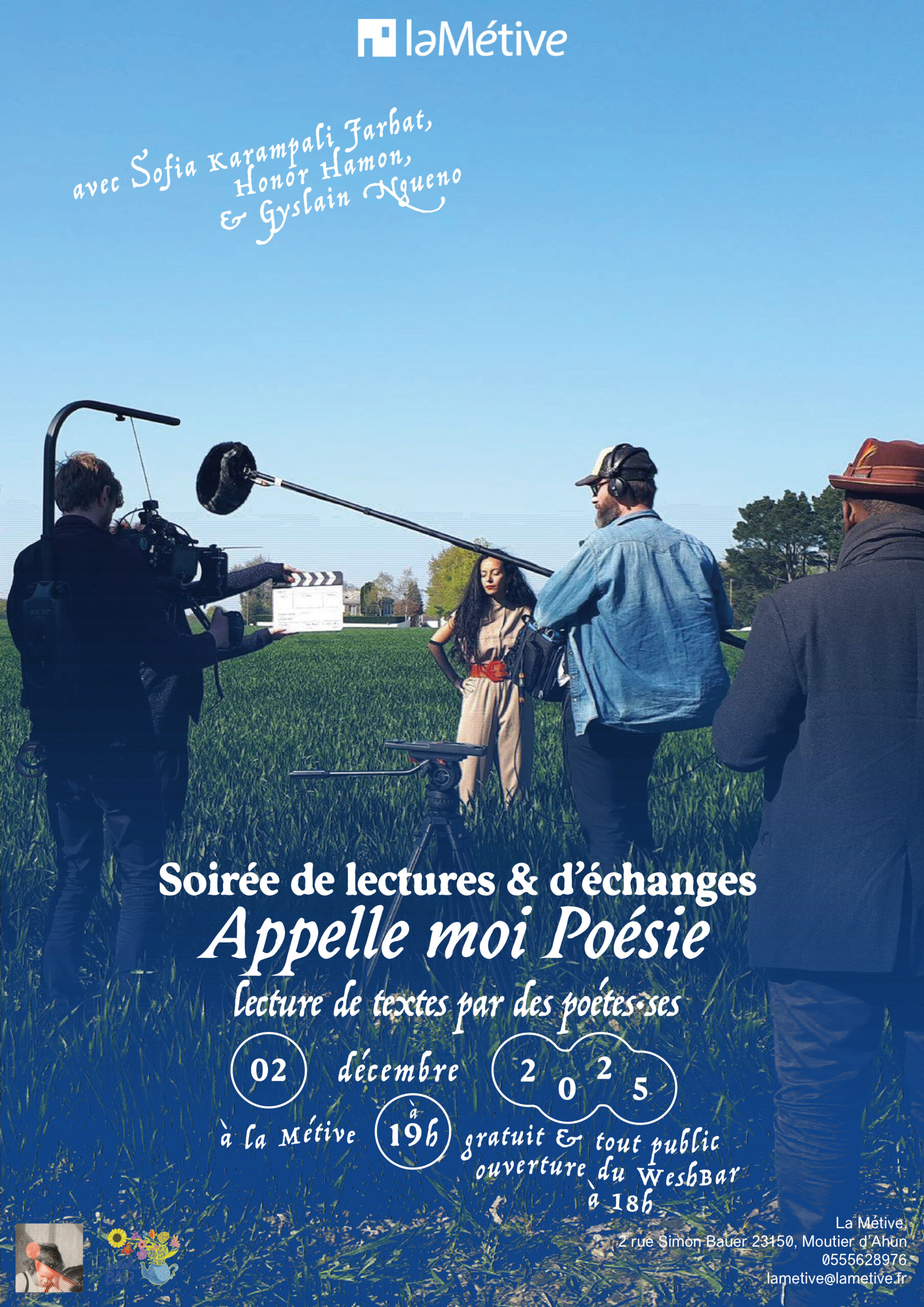 La semaine prochaine, La Métive accueille plusieurs poète·sses en résidence dans le cadre tu tournage de la saison 5 de la série Appelle-Moi Poésie. Mardi soir, le 2 décembre, à l’occasion de l’ouverture du WeshBar qui ouvre à 18h, nous vous invitons à une soirée spéciale autour de la lecture et de la rencontre.