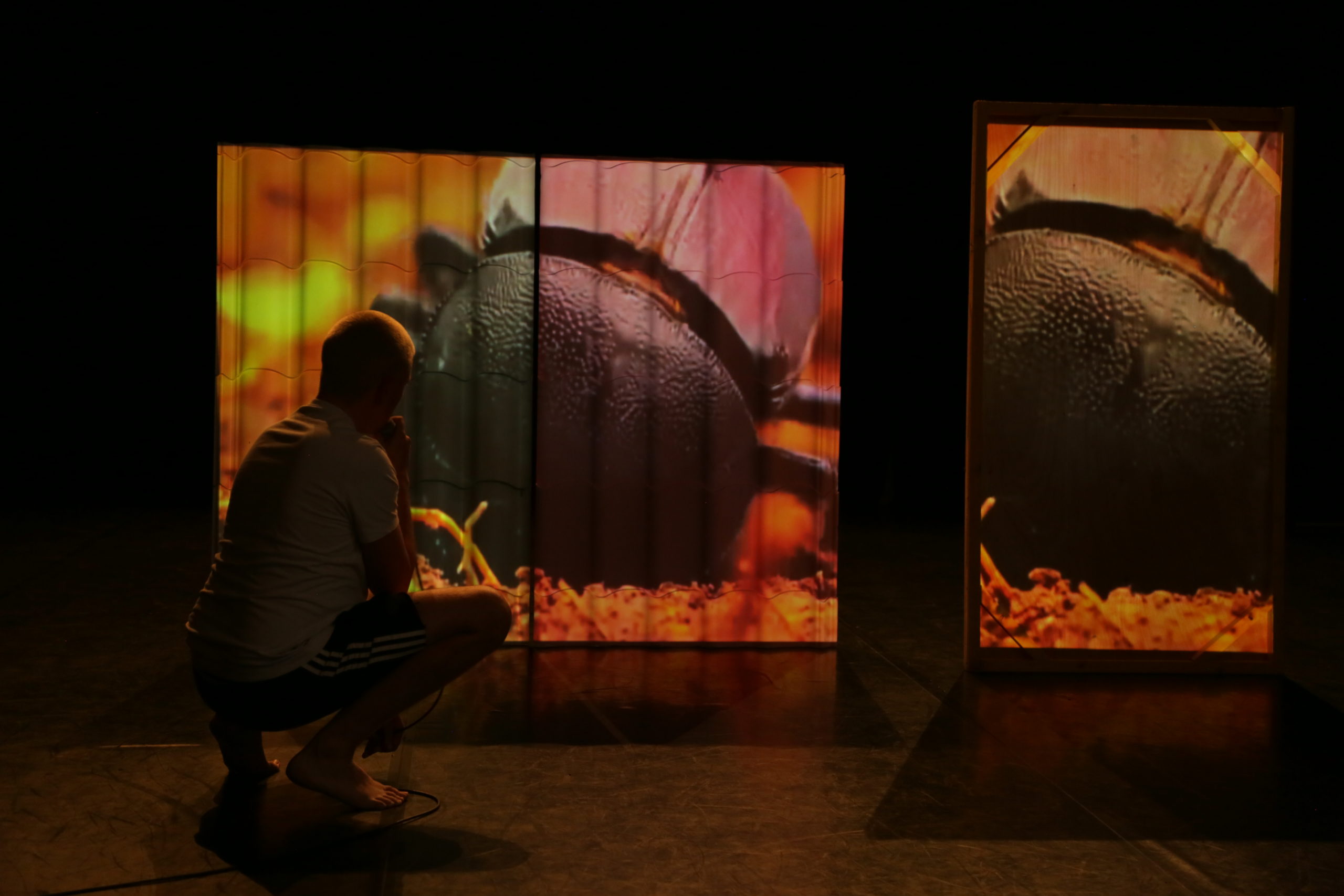 Ces Filleuls ce sont d’abord trois portraits : il y a Marcel, le fils d’une amie, Kelvyn, rencontré par une association et Alex, croisé au sein de la communauté queer… Trois garçons, enfant, ado et presque adulte, tous parrainés par Lucien Fradin. C’est une histoire de rencontres, de liens, une histoire pour enfants qui dessine d’autres familles possibles. Entre documentaire et autofiction, Filleuls s’inscrit dans la recherche entamée par l’artiste lillois autour du réel et de la famille. Dans Eperlecques, qui abordait une partie de son adolescence, on entendait les voix de ses parents ; dans Wulverdinghe, c’était sa grand-mère maternelle qui intervenait sur scène. Cette fois, à travers la présence vidéo ou réelle de ses trois filleuls, le jeune acteur-metteur en scène explore le rapport à l’enfance et le désir d’enfant, mais aussi les questions d’identités, de modèles et de transmission. Toutes ces questions, il les décale avec humour dans un espace évolutif aux couleurs pop et joyeuses et à travers la métaphore des insectes offrant une plongée dans un monde microscopique et onirique.